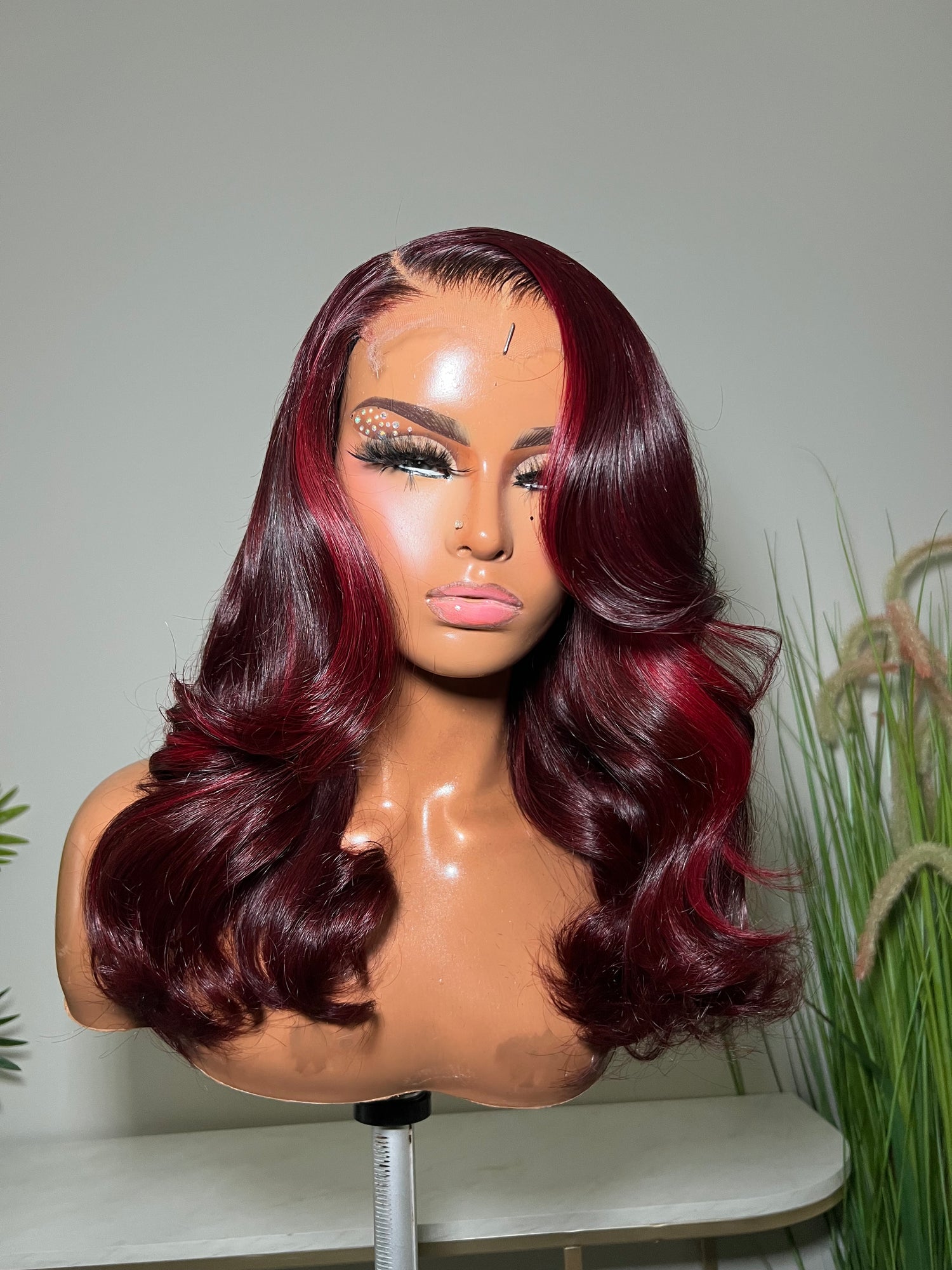 Rich, deep burgundy with subtle light red dimension highlights that catches the light effortlessly. Styled in soft, voluminous body waves with a sleek side part for that timeless, face-framing glam.